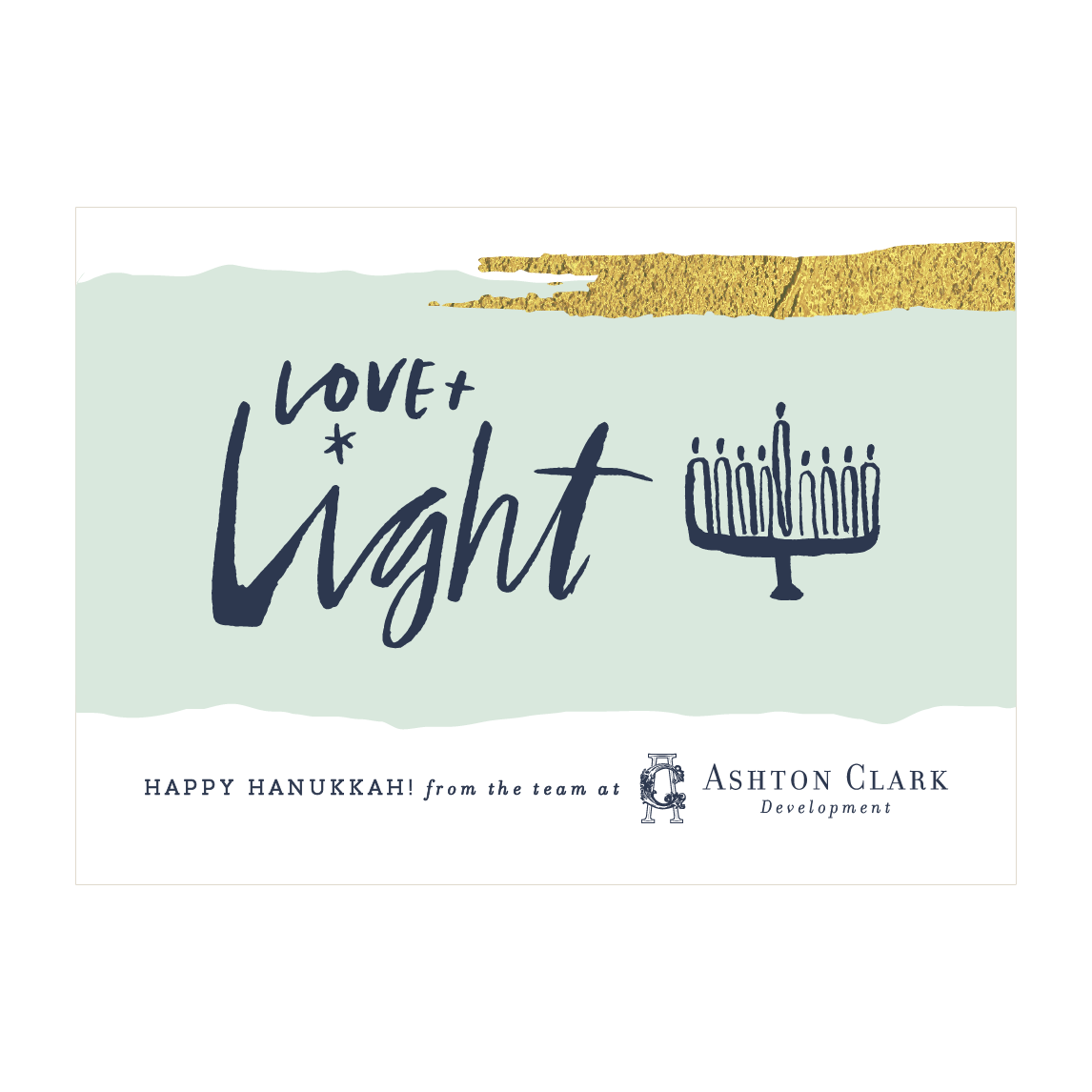 Faux foil detailing, bold brush lettering and illustration for a modern Hannukah greeting.