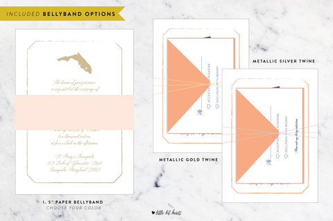 What it includes: a 5 x 7 invitation card, a mailing envelope, a 3.5 x 5 response card with printed envelope + postage, and a bellyband to hold the set together