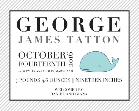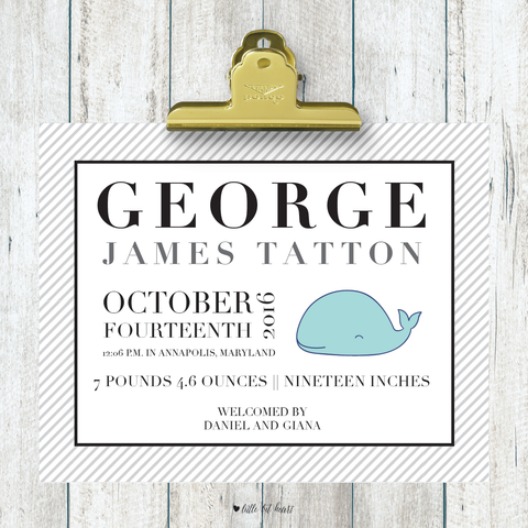 Perfect for a little sailor's nursery, this preppy and classic custom art print is personalized with baby's birth details and features a whimsical whale illustration.