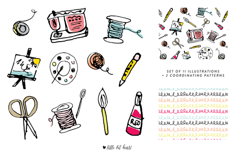 Set of 11 Handdrawn Crafting Illustrations: bobbin with yellow thread, sewing machine, spool of blue thread, easel with painting, painter's palette, orange yarn, pencil, scissors, pink thread and needle, paintbrush, and tube of red paint.