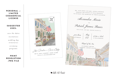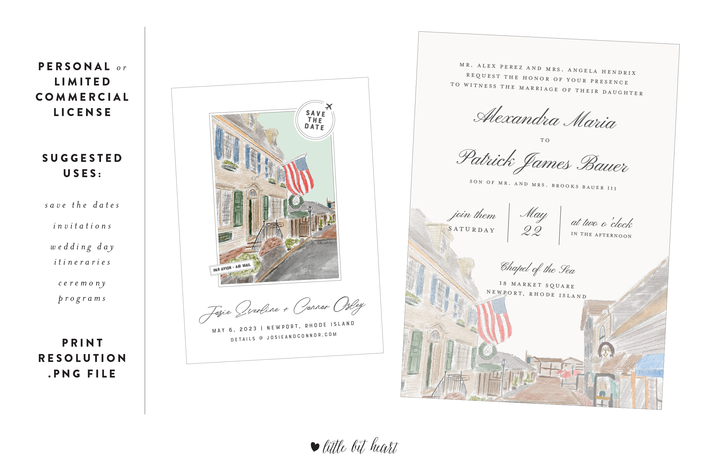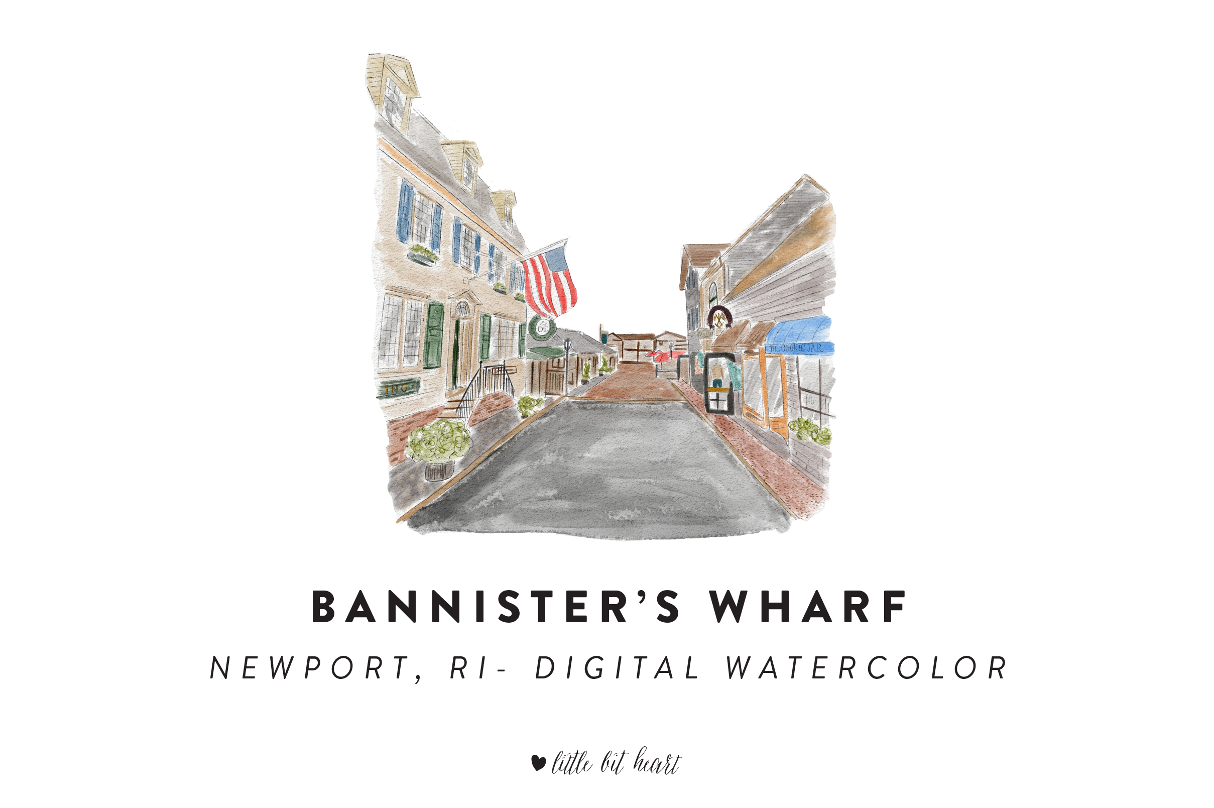 Add a bespoke touch to your wedding stationery project with this handpainted digital watercolor illustration of Bannister's Wharf in Newport, Rhode Island.