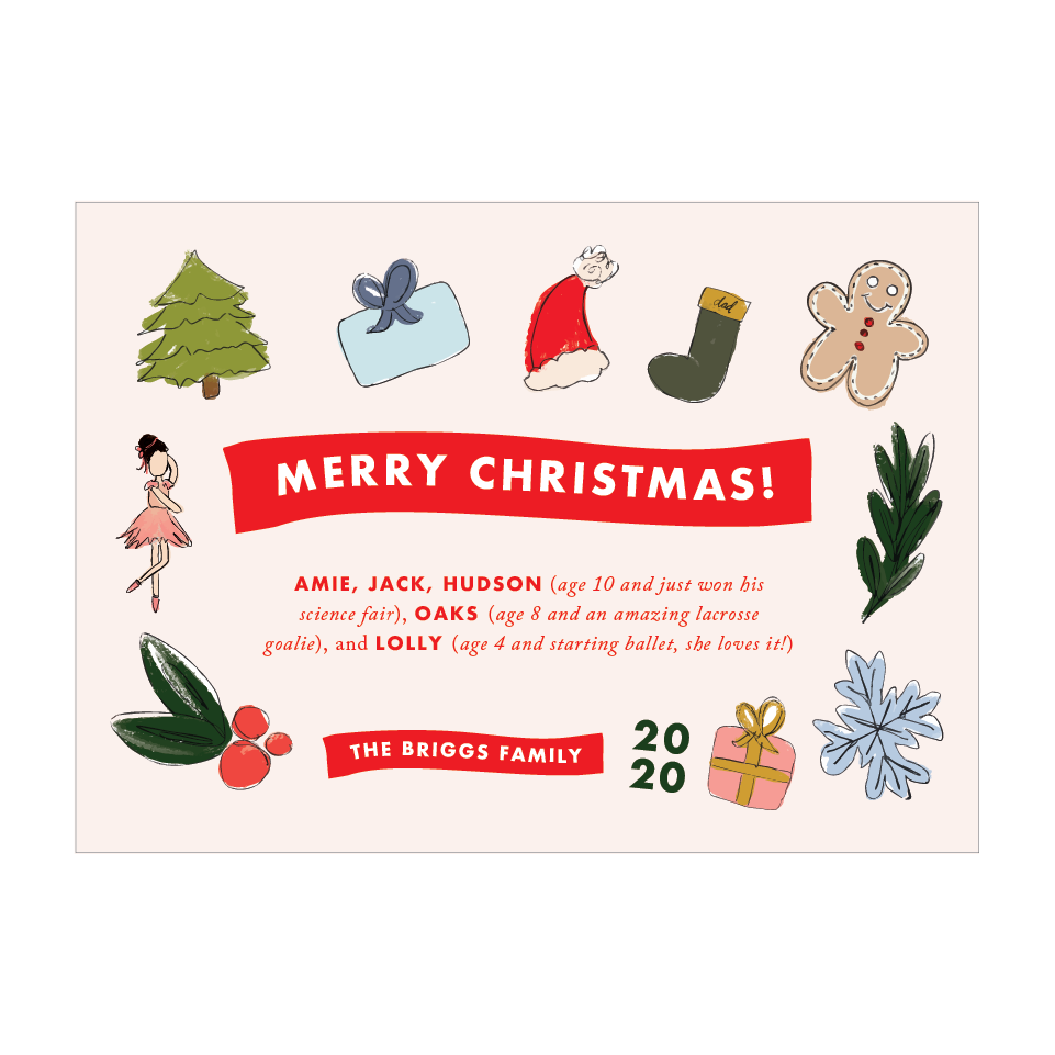Featuring handdrawn icons of the season and a bright color palette, this cheerful card also offers space for a family or company update.
